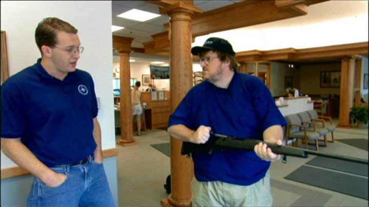 Kevyen ulkokuoren dokumentille muodostaa Mooren tapa haastatella kohteitaan, varsinkin jos he ovat niin ikään epäilyksen alaisina. Hän rentouttaa haastateltavansa huumorilla, nakkaa väliin aina vakavan kysymyksen, ja ennen kuin haastateltava tajuaa mitä on vastannut tahattomasti tai tarkoituksella, hän siirtyy toiseen aiheeseen tai kysymykseen. Mukaan on pistetty myös hauskahko animaatio a Brief History of United States of America, jossa selviää miksi amerikkalaiset ovat niin väkivaltaisia kanssaihmisiään kohtaan. Tämän lisäksi Moore vertaa Yhdysvaltojen tilannetta Kanadaan ja lähtee paikanpäälle selvittämään syitä siihen, miksi Kanadassa ihmisiä ei kuole yhtä tiheään tahtiin aseiden kautta kuin Yhdysvalloissa. Osiossa tulee esille erittäin mielenkiintoisia seikkoja.