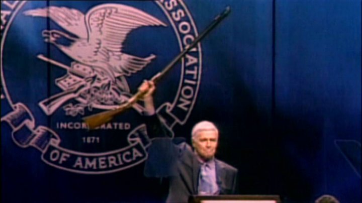 itse itsensä pussiin. Puheenvuoron saavat myös maailman suurimman aseteknologiayrityksen edustaja, NRA:n (National Rifle Association, kansallinen kivääriliitto), puheenjohtajana toimiva, ikääntyvä elokuvatähti Charlton Heston.