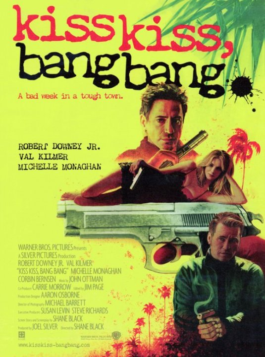 Shane Black on sen verran seurannut uransa aikana hyvien ohjaajien duunia, että jotain taiasta on tarttunut myös miehen omaan käsialaan. Mikä draaman kuljetuksessa hävitään, sen Black kääntää vinosti virnistelevällä otteellaan kirkkaasti voitoksi, sillä Kiss Kiss Bang Bang kulkee kuin ydinkäyttöinen luotijuna. Kieltä on vaikea enää enempää poskeen tunkea, sillä samalla kun Black sivaltelee hulppean huumorin teräväpäisellä ruoskalla kaikkia mahdollisia tahoja tasapuolisesti, mies tekee maanmainiota meta-elokuvaa ja potkii myös itseään säälimättä.